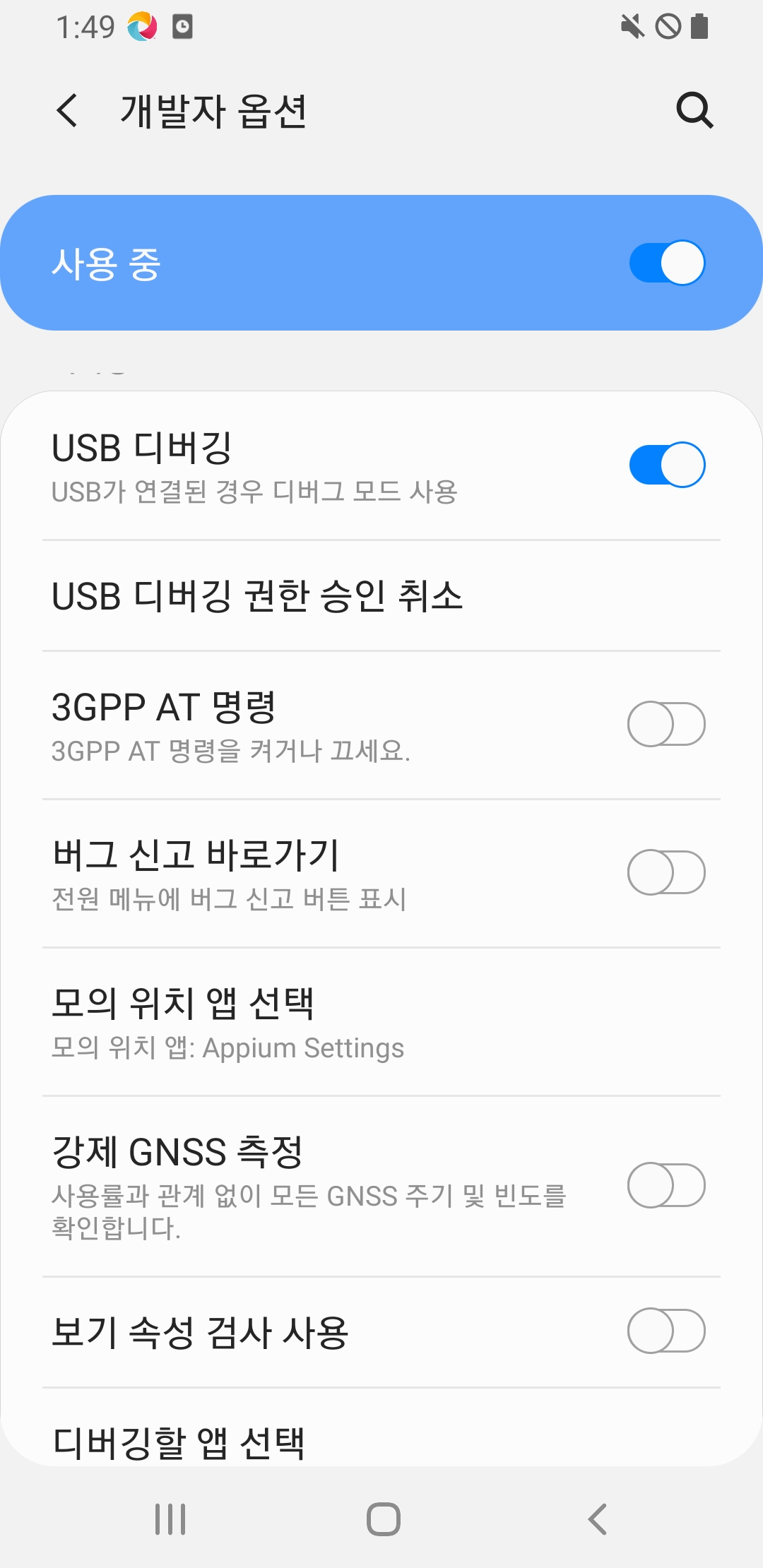 개발자 모드에 진입하여 USB 디버깅을 활성화합니다.
