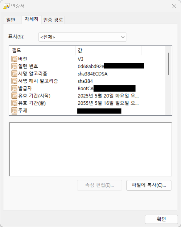인증서 파일 내 자세히 탭에서 필드, 값을 확인 가능합니다.