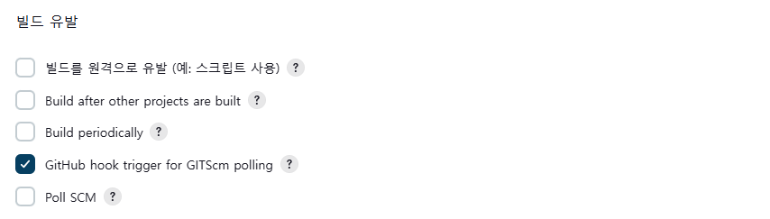 하단에 빌드 유발 > Github hook trigger for GITScm polling 활성화합니다.