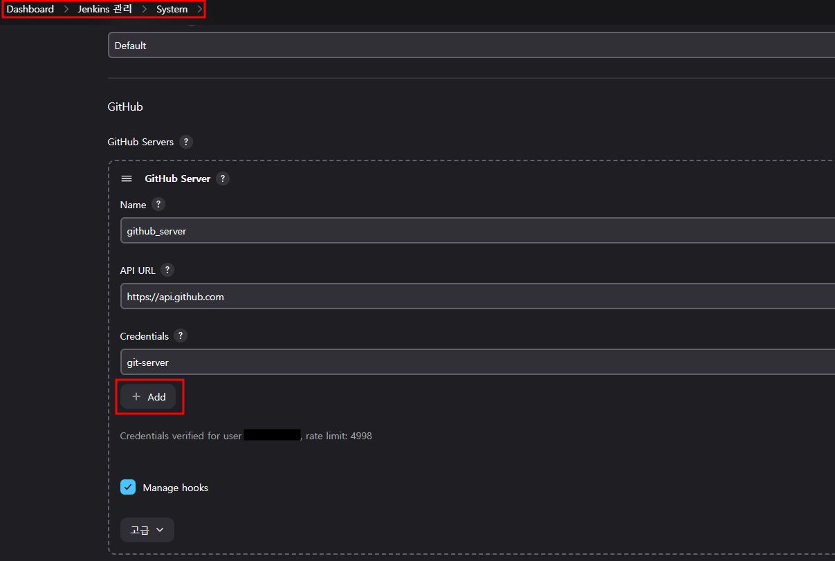 대시보드 > Jenkins 관리 > System 내 Github 서버 정보를 입력합니다.